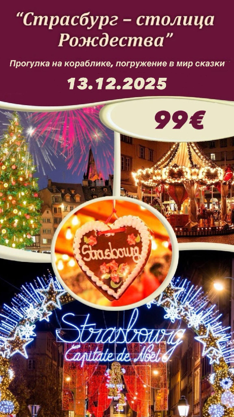 Вы направляетесь в столицу Эльзаса – Страсбург, расположенный на рейнской границе Франции и Германии. Страсбург – одна из трех столиц Евросоюза. А еще Страсбург называют "столицей Рождества". Именно здесь в 1570 году состоялось открытие первой рождественской ярмарки в Европе, которая называлась «Christkindelsmärik» (рынок Младенца Иисуса). И с тех пор ежегодно с конца ноября город меняется почти до неузнаваемости: из спокойного и романтичного Страсбург становится шумным, сияющим, ярким. Здесь украшено всё: деревья, дома, окна, дороги, скамейки... Гирлянды из хвои и букеты из искусственных цветов, бусы и красные банты, огромные фигурки в виде рождественского печенья, плюшевые игрушки и ленты – фантазии декораторов безграничны! На площади Клебер устанавливается гигантская рождественская елка, украшенная сотнями шаров по 3-4 килограмма каждый и грандиозной гирляндой. С наступлением темноты сияние 11000 лампочек превращают пушистую красавицу в настоящее рождественское чудо. Рождественские рынки Страсбурга, а их здесь двенадцать, предлагают праздничные украшения, авторские елочные игрушки, изделия местных ремесленников и блюда национальной кухни, невероятно вкусные деликатесы и вина региона Эльзас. Ваша экскурсия по Страсбургу пройдет в атмосфере рождественской сказки.